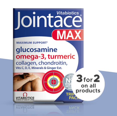 Good things come in threes – and Jointace Max gives you triple support with Collagen, Glucosamine, Turmeric, Chondroitin, and super-strength Omega-3 in one box.