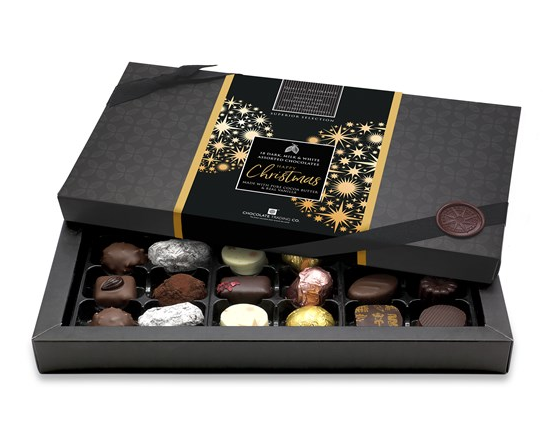 Each selection box contains a diverse and superior quality assortment of 18 caramelised pralines, truffles, natural fruit ganache, nougat, salted caramel, marzipan, liquor and single origin chocolates. Contents do vary and so always ensuring the freshest chocolate selection.